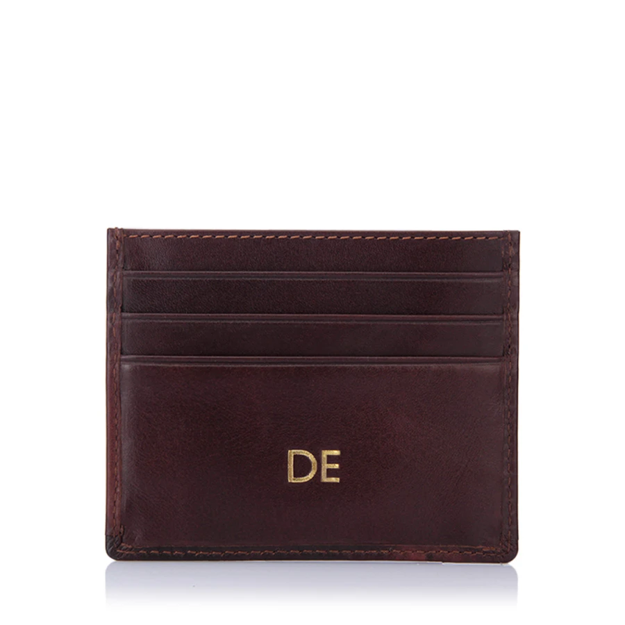 Brown leather personalised card holder from Visconti, embossed by Engravers Guild of London with either gold foil, silver foil or blind. This slimline card holder offers six credit card pockets and a central slip compartment for daily essentials such as notes or coins. Designed to offer a more discrete line when carried in a pocket, this personalised wallet is hand crafted from vegetable tan leather and finished with a luxurious lining.