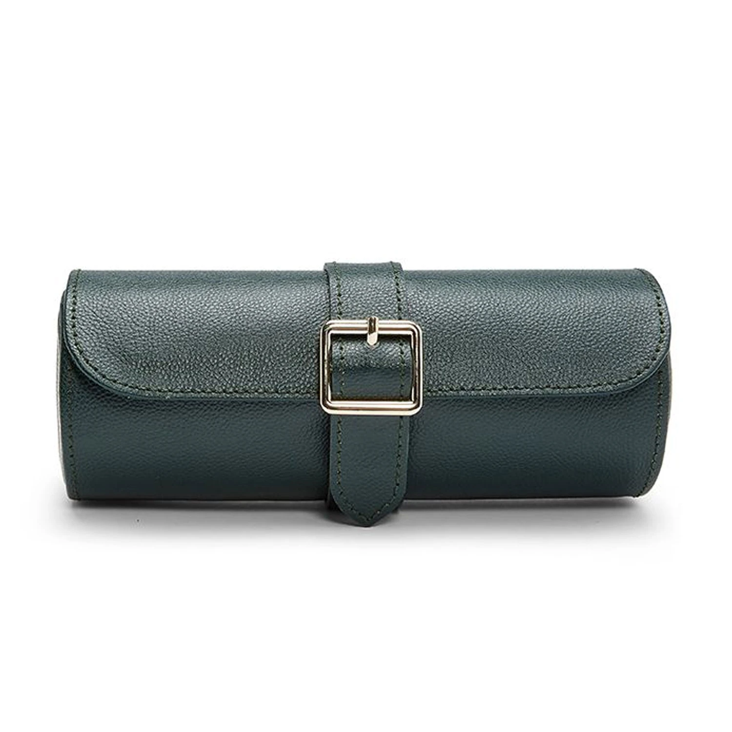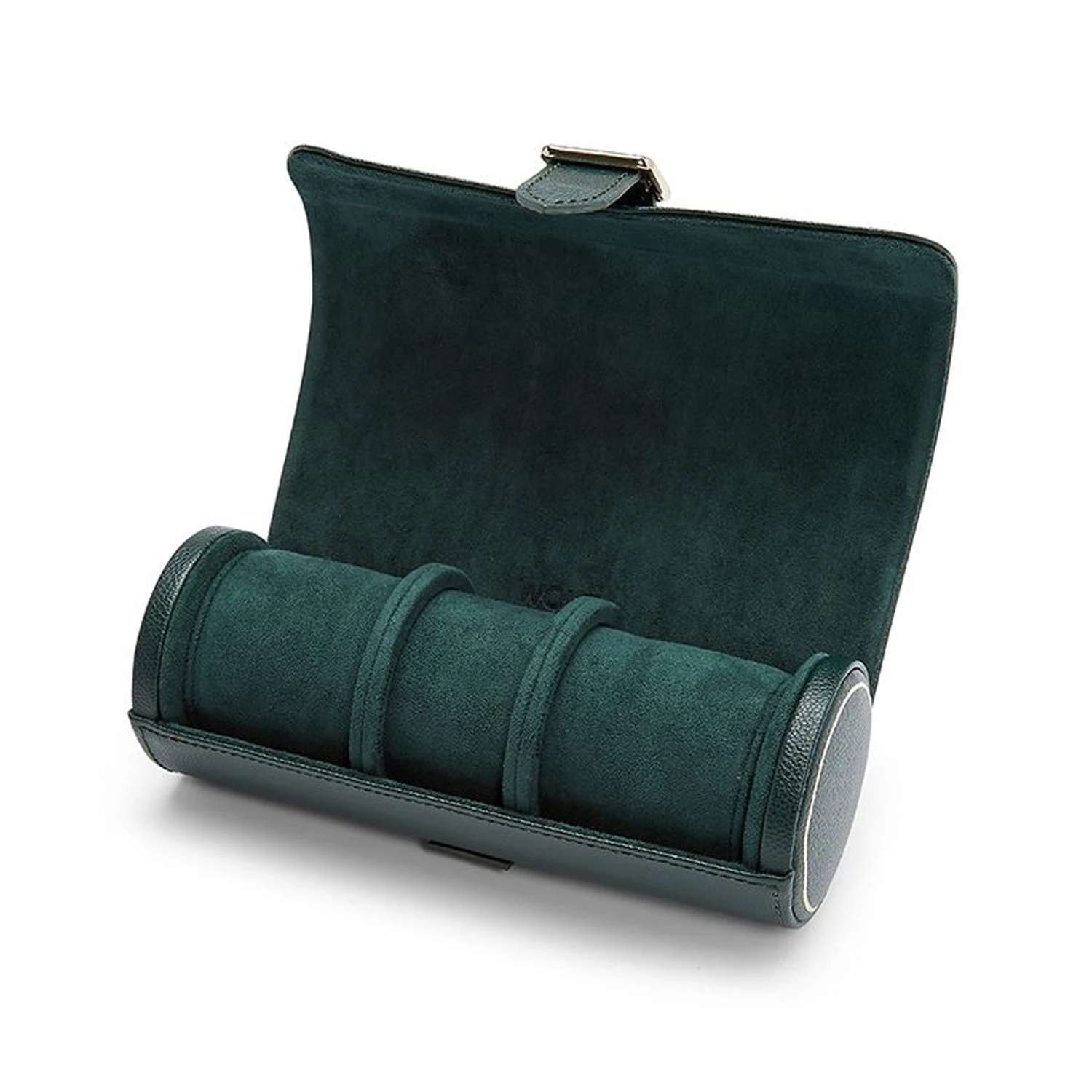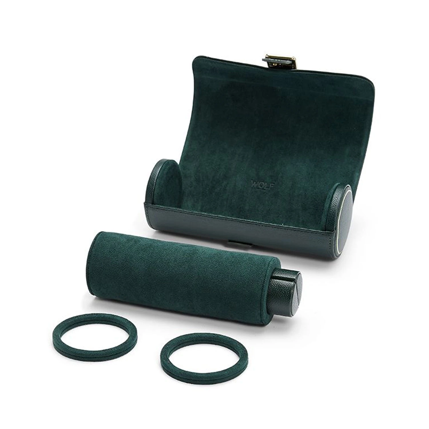 A genuine leather triple watch roll from Wolf 1834 in a deep green colour. Protect your watches in style while traveling in this triple watch roll. Includes space for up to 3 watches with 2 Watch Guards and adjustable snap closure. Plus a hidden jewellery capsule inside of the watch roll with three compartments for safe keeping of cufflinks, rings and other smaller valuables.