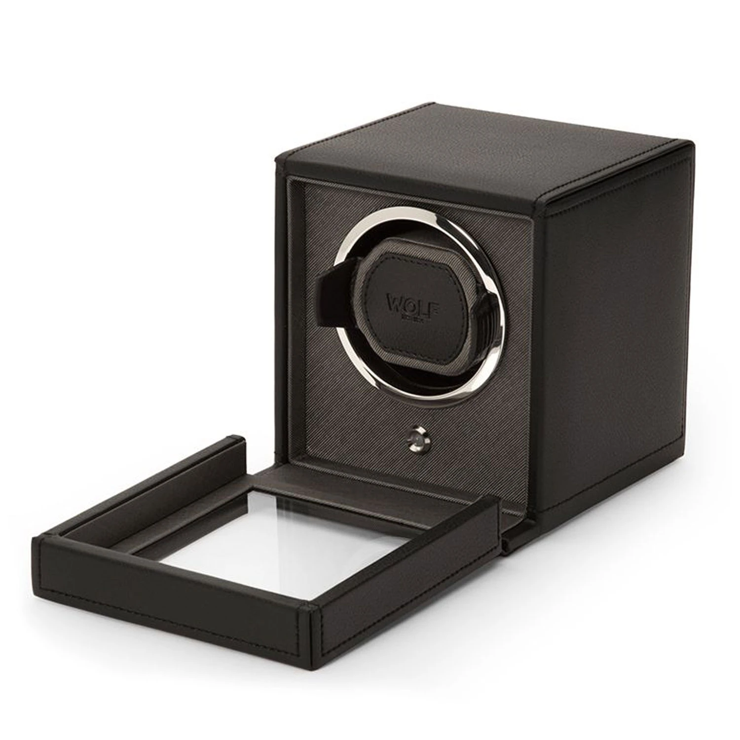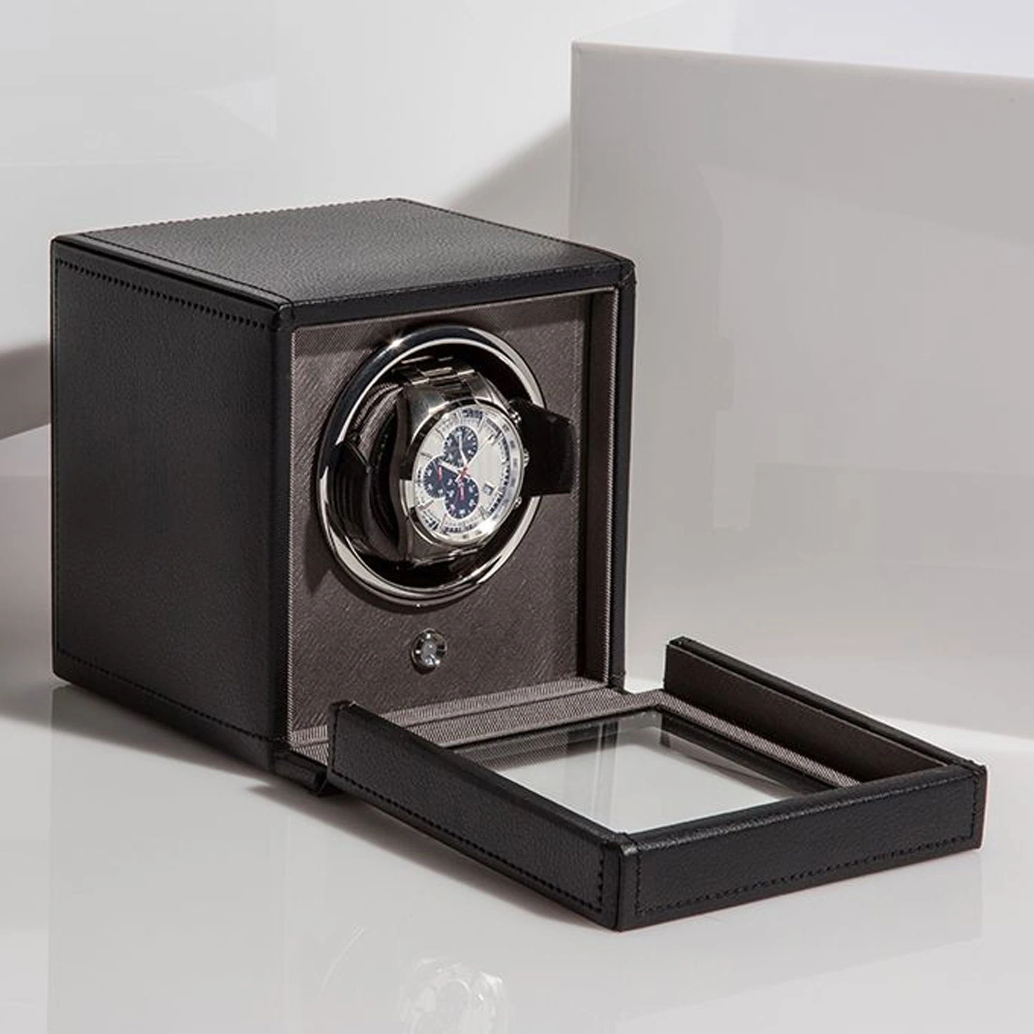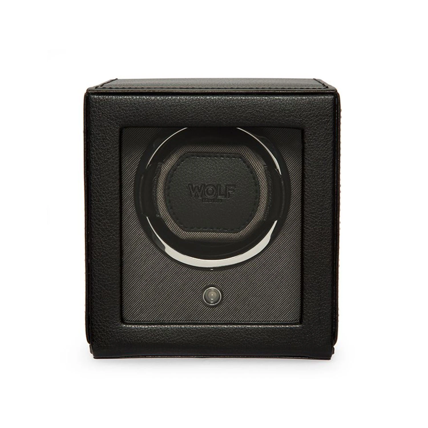 A vegan leather patented Cub watch winder from Wolf 1834. Young, smart and uncomplicated, the Cub watch winder takes care of your watch with ease. Six sides perfectly proportioned to encase your timepiece safely and precisely. Never miss a beat in your busy life. Created with patented innovation – every WOLF winder counts the precise number of rotations. All other winders estimate the number of rotations. This watch winder also features patented lock-in dynamic cuff which ‘locks’ your timepiece into the rotator drum for a secure fit as well as the option of either battery or mains power.