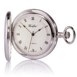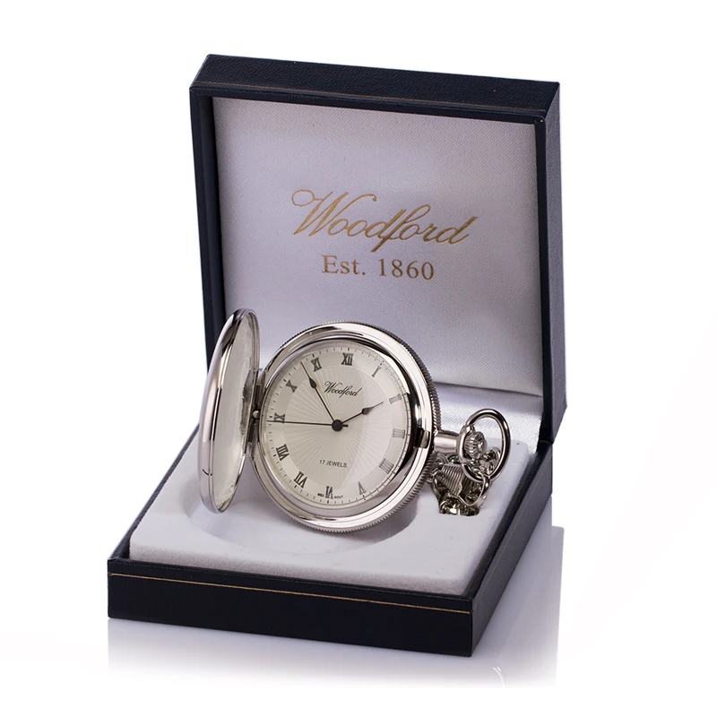 Personalised Woodford chrome finished pocket watch with 17 jewel mechanical movement. This classic timepiece imbues all the sensibility of a classic pocket watch. The clean dial features Roman numeral characters around a circular radial pattern in the centre of the face. The houndstooth finish around the edge of the pocket watch creates sophisticated interest, with the engraving being centre-stage on the front of the timepiece.