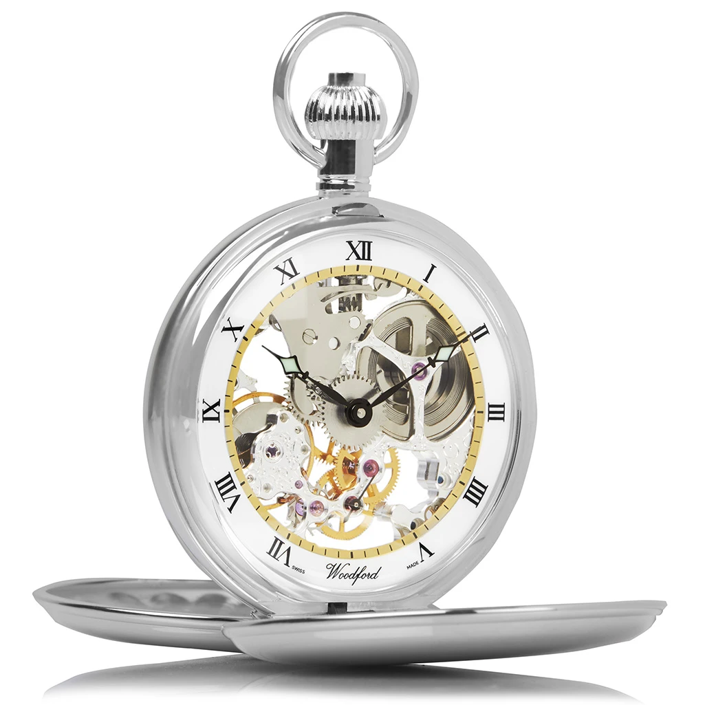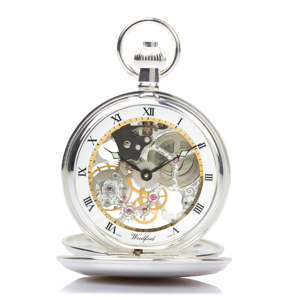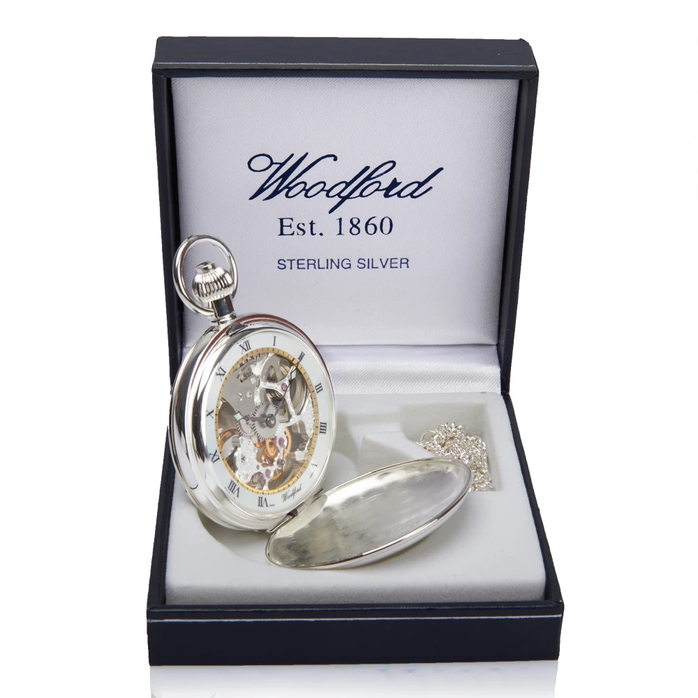 Woodford sterling silver skeleton pocket watch with 17 jewel mechanical movement and twin lid self standing case. The white dial features classic black Roman numerals, with a gold edge around the visual window. This Swiss made movement guarantees high level precision and outstanding quality.
