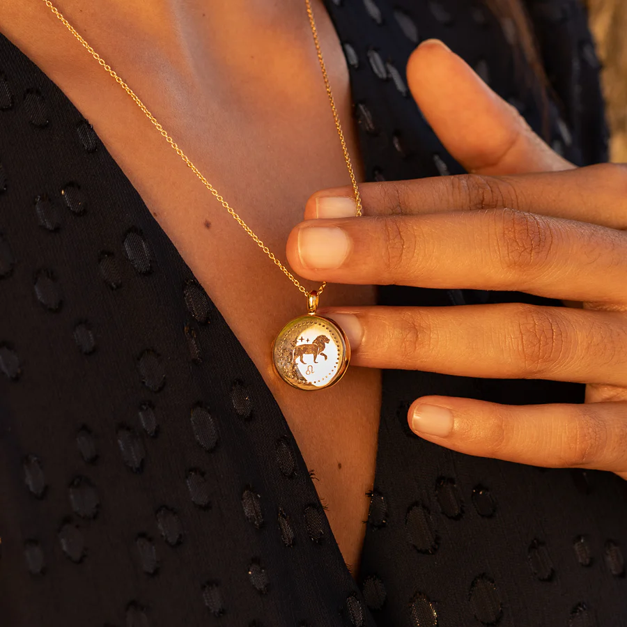 Beautiful round locket made of solid 925 sterling silver with 18k gold plate, featuring an engraved symbol of the Zodiac on the front. This piece from Lovelox boasts classic proportions, and is exquisitely finished to offer a necklace of superior quality. The hinge is expertly integrated into the line of the locket, thus barely breaking the flow of the circle. Personalised by Engravers Guild of London, this item of jewellery is designed to last as an extremely special gift for many years to come.